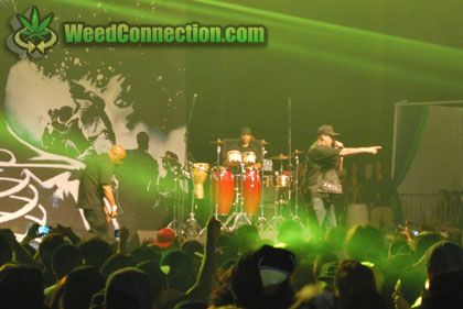 There are three main entrances to the NOS Events Center, which I have experienced on separate occasions. First, General Admission leads you by a large pond with a fountain. Second, the Patients entrance leads into the larger designated medicating area. Third, the V.I.P. entrance leads into a more exclusive area with some cabanas and not much the civilians should feel like they are missing out on. We proceeded through the Patient entrance and made our way into the stage area to catch the end of the Dogg Pound. We then visited the medical marijuana expo, hollered at some of my connects, snapped a few shots of the discussion panel, checked out the outdoor vendors, took more photos, passed out some Weed Connection cards including one to a cute girl in a sounds like WeedCraps T; told her the truth about how she would be more cool if she were wearing a Weed Connection shirt. Somewhere between drinking, smoking, eating and straight west coasting we saw the headliners.
