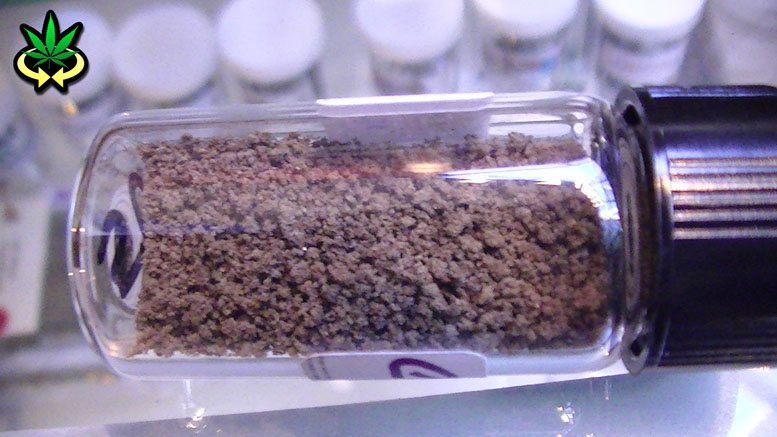 Dark brown in color, bitty and grainy, this concentrated cannabis looks more like